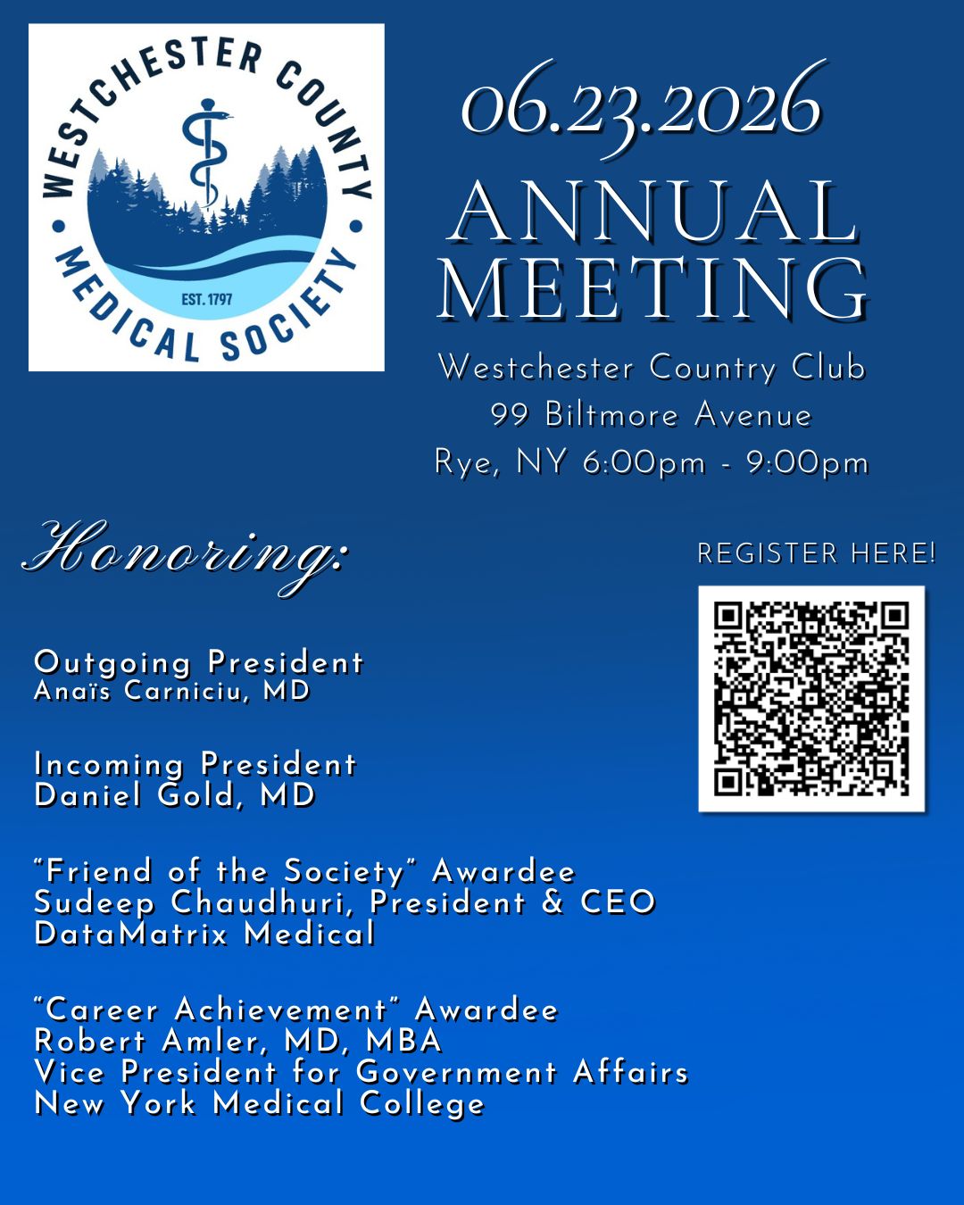The Annual Meeting will take place on Thursday, June 23, 2026 from 6:00pm-9:00pm at the Westchester Country Club in Rye, New York.